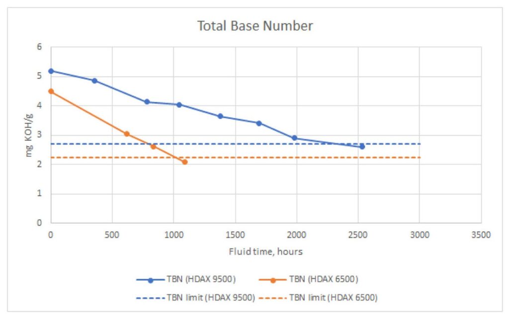 TBN (Total Base Number) analysis is one of the most important parameters in assessing the quality of the gas engine oil, especially in the long term. It can be seen from the graph below that the limits set by the OEM were reached after 1,000 operating hours with Texaco HDAX 6500 and after 2,200 hours with Texaco HDAX 9500. Because the TBN measures the capacity of the gas engine oil to neutralise acids, it is clear that Texaco HDAX 9500 maintains its ability to protect the engine parts during extended periods of oil service, an important consideration when working with particularly aggressive gas. Texaco HDAX 9500 helps contribute to the control of carbonaceous deposits on pistons, with good wear-prevention and anti-scuffing performances, helping to prolong the engine’s life cycle, which in turn leads to greater operativity and profitability.